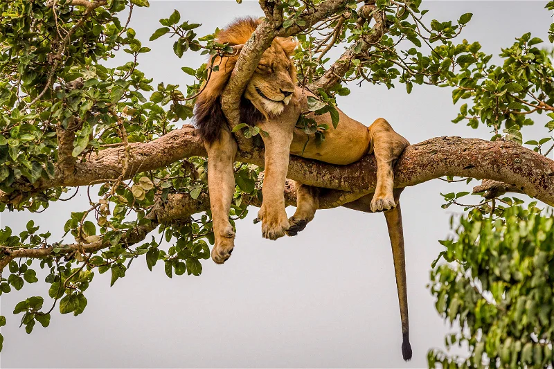 Capture unique shots of lions lounging in trees, a rare phenomenon seen in Uganda’s Queen Elizabeth National Park.